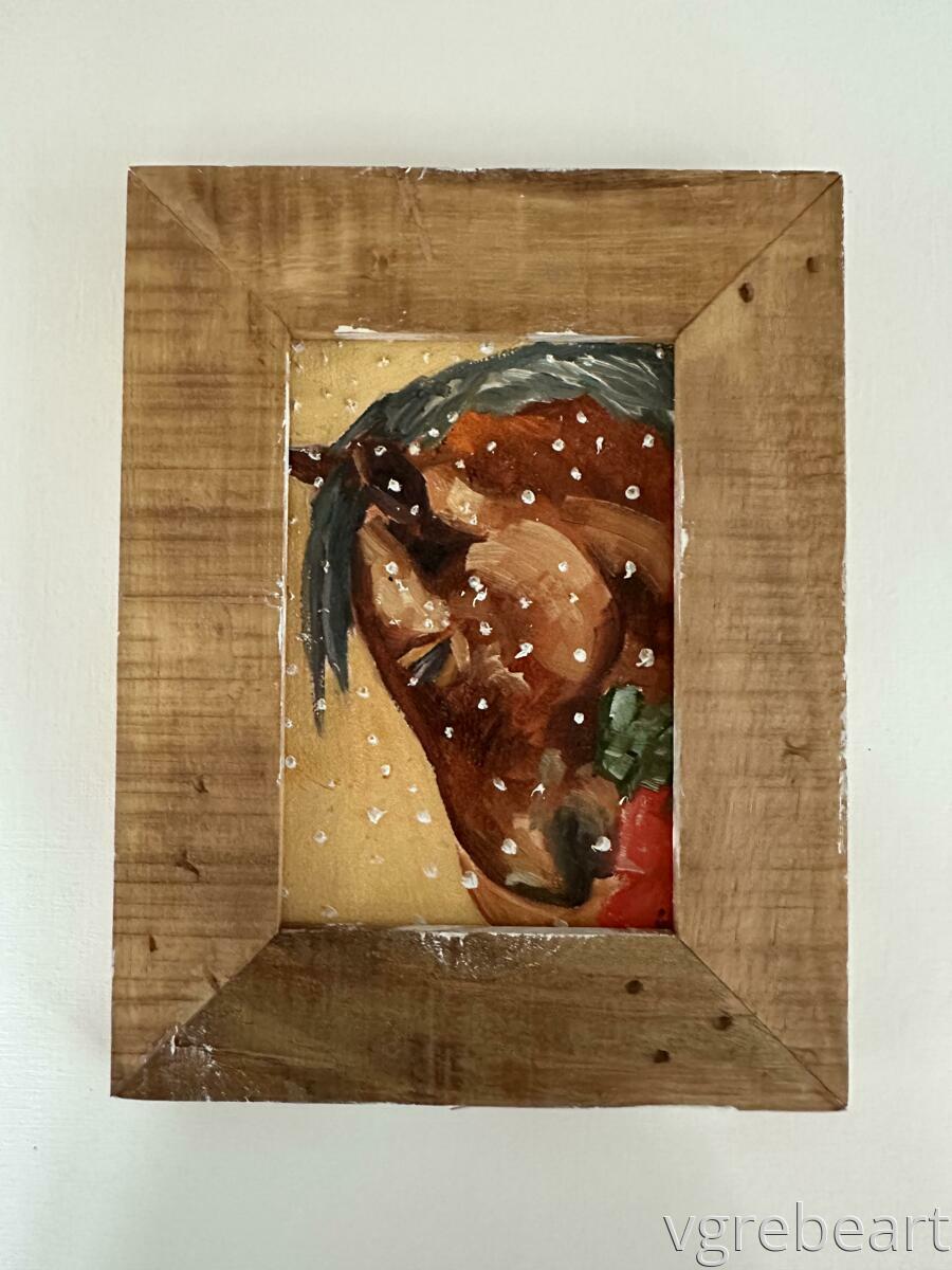 A warm and comfortable holiday horse in the snow. 4" x 6" oil on canvas panel rustic wood frame.