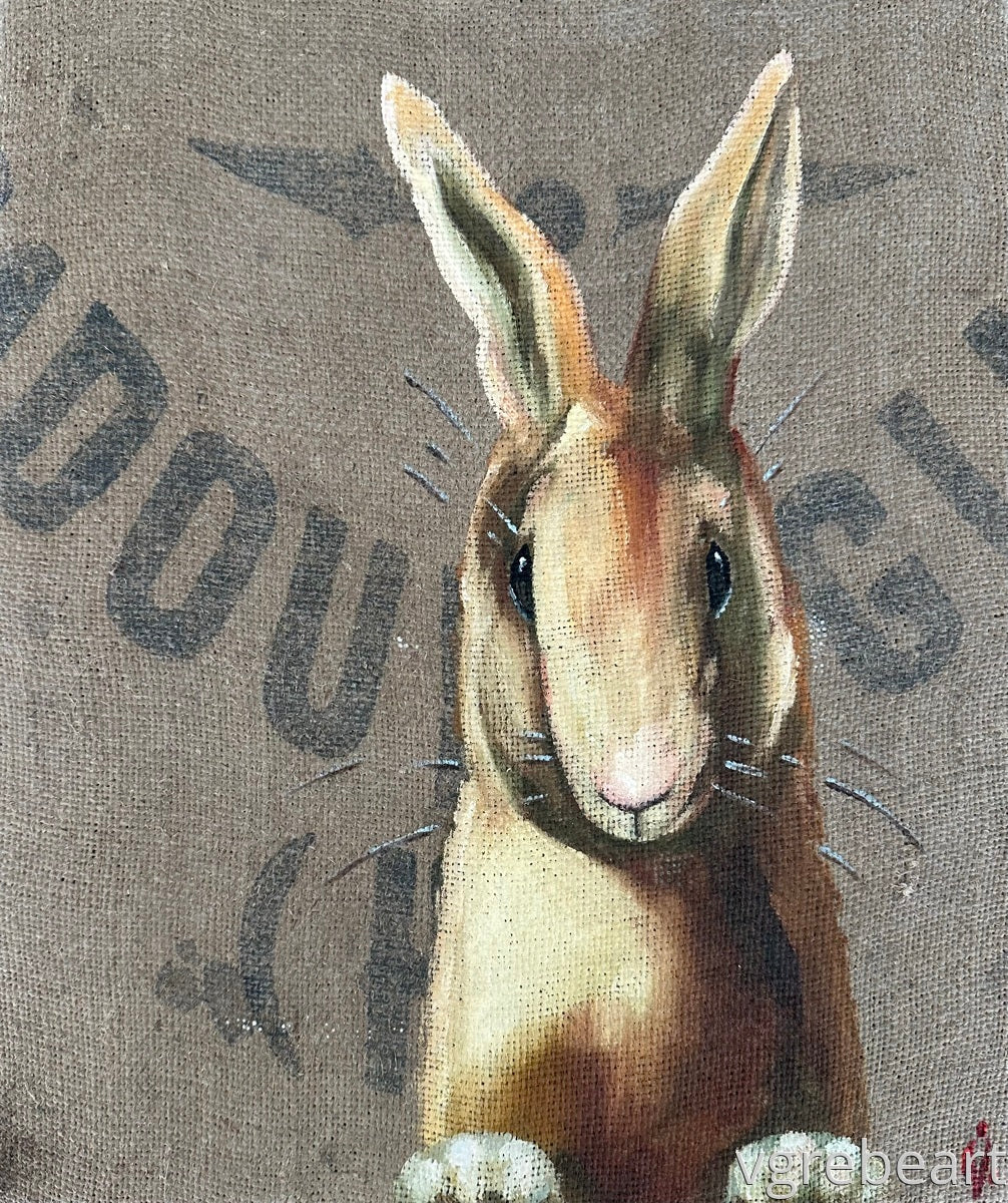 Painted on an antique French grain sack and finished with hand applied rivets.