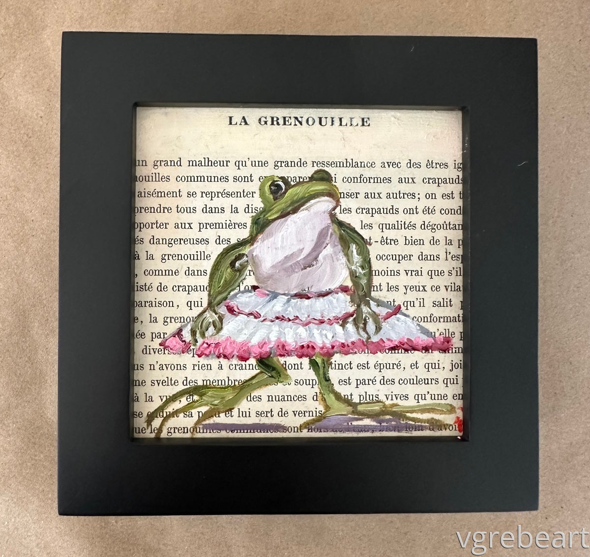 A little French frog in a tutu. Need I add more? 4" x 4" oil on antique French paper.
