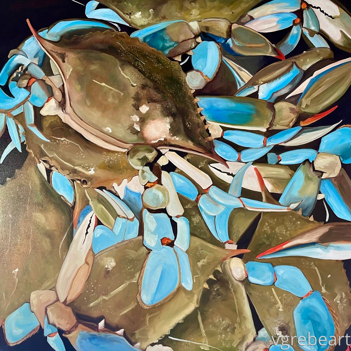 Gorgeous colors in this large format painting. These are the Maryland blue crabs before they go in the pot; legs and cool green shells. Almost abstract. 36 x 36" oil on gallery wrapped canvas.