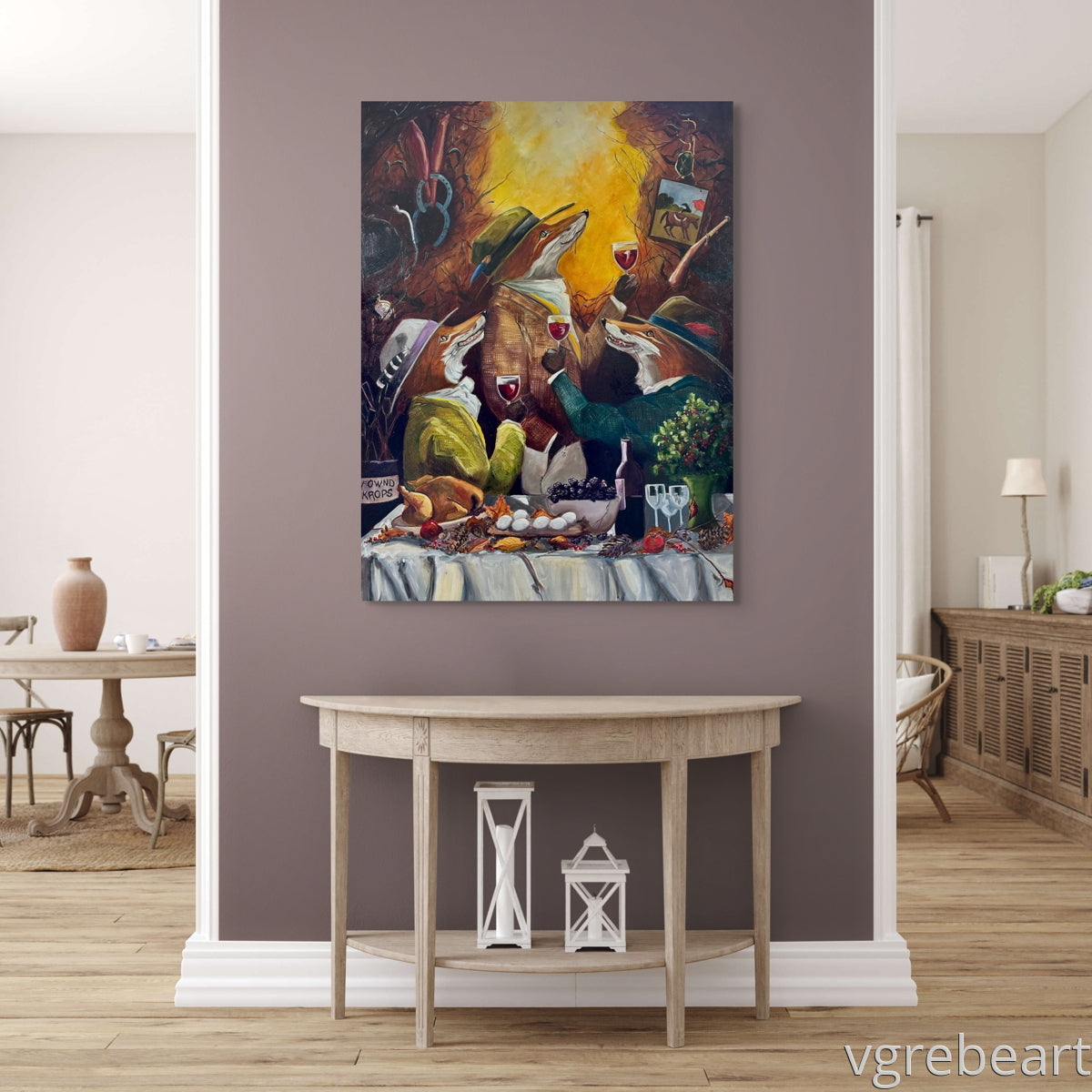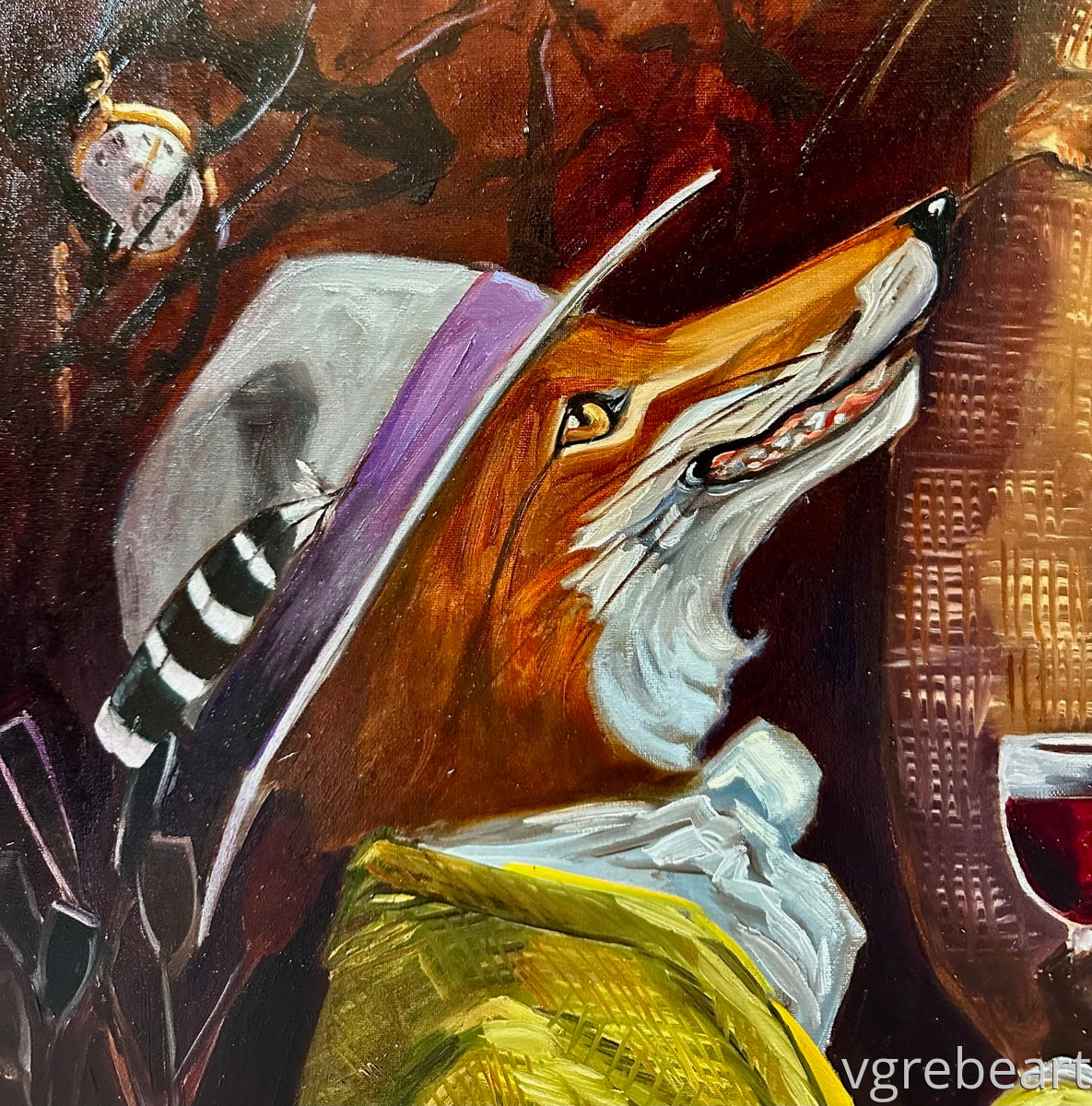 This painting is just fun. If you follow my work then you know the fox is my muse; painted wearing a feathered hat, a ruffled collar, sometimes a hacking jacket.