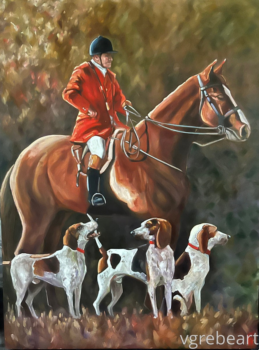 A rather dapper hunter, certainly an experienced one, waiting with his hounds.
