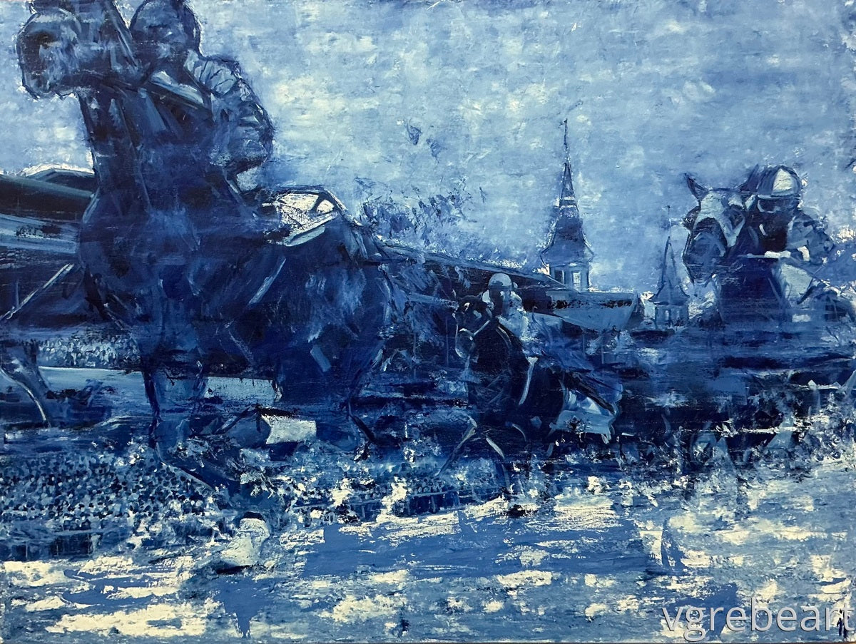 Large format and almost abstract painting of the iconic “run for the roses” at Churchill Downs.