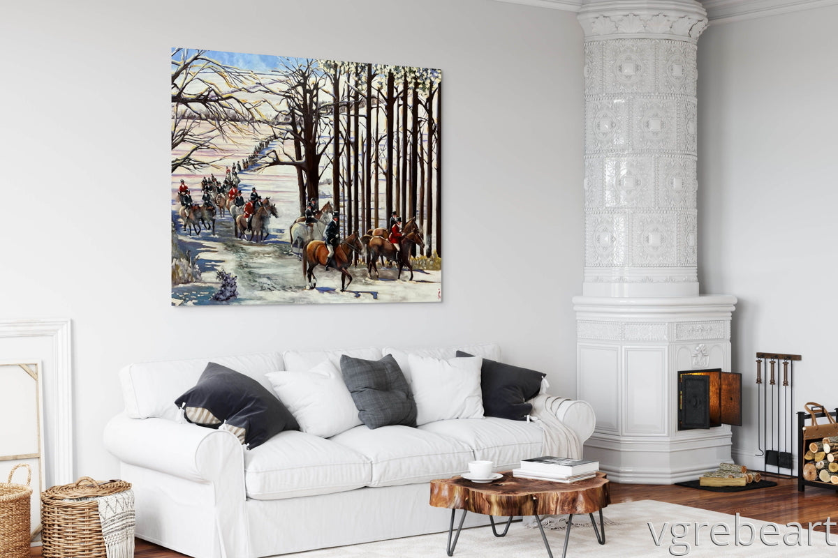 This painting radiates with morning light and the cool soft shadows coming from the tree limbs and riders.
