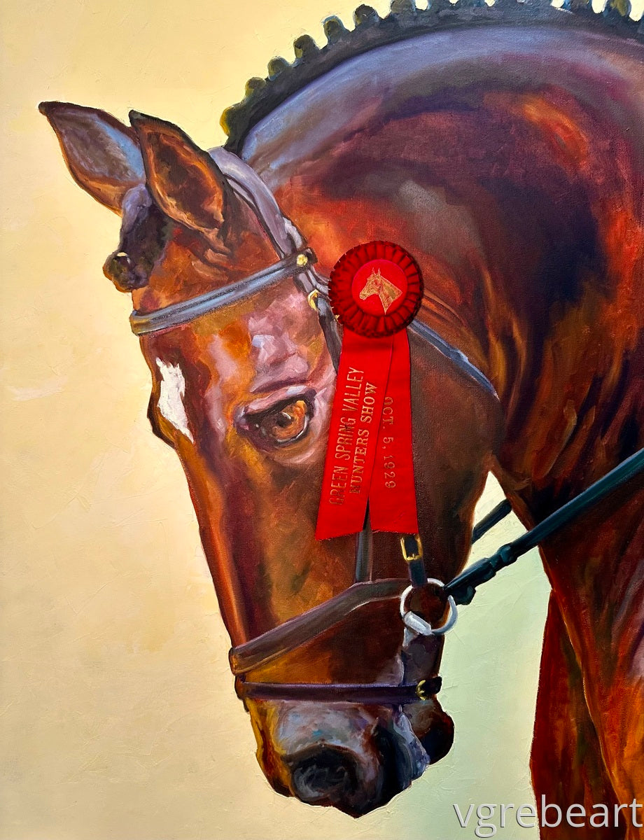 Gorgeous horse...a definite winner. This painting is full on color...the background is cold wax adding a nice contrast to the silky coat of the horse. The addition of the authentic antique ribbon makes his beauty all the more apparent.