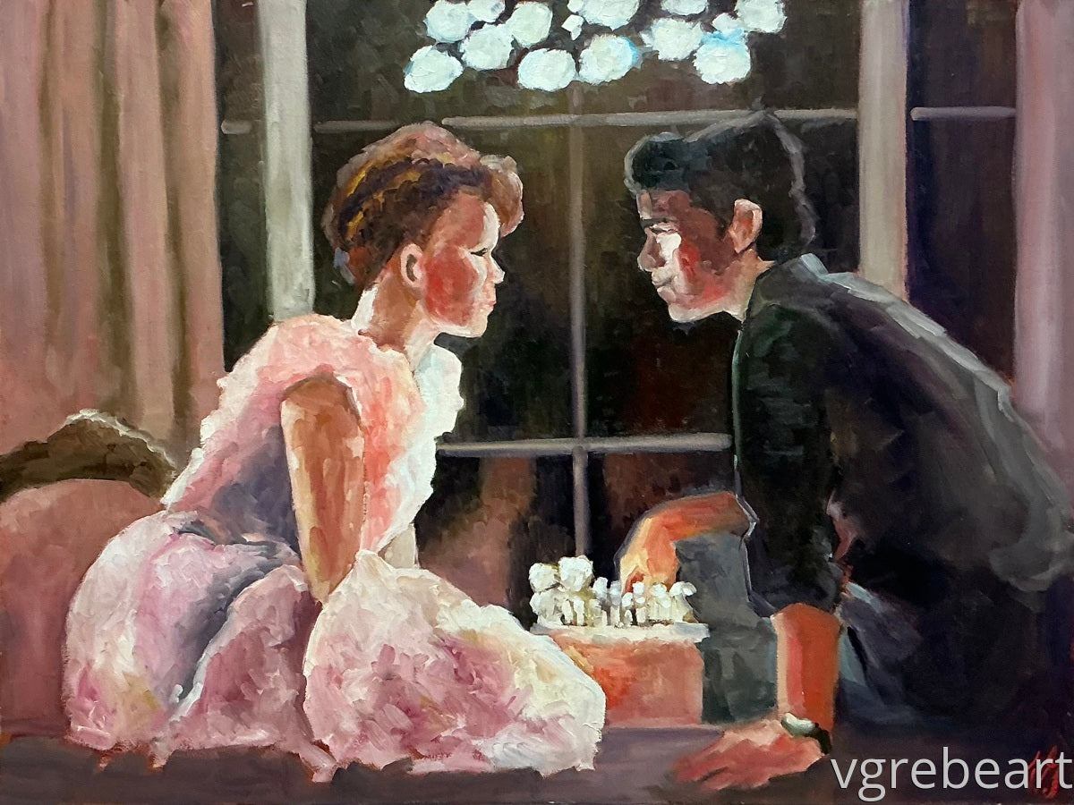 Sam and Jake...swoon. This is a gorgeous rendition of that fateful moment right before the kiss...truly fun to paint...I used a brush that is 24” long and then stood about another two feet from the canvas...so the strokes are really loose and flow in a very cool way.