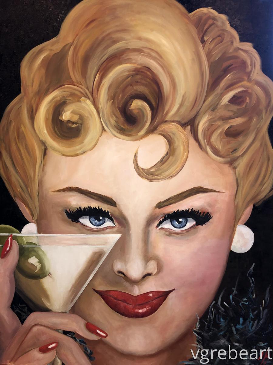 She's saucy and quite the temptress with her pin curls and martini. Beautiful colors. Perfect for bar or club room.